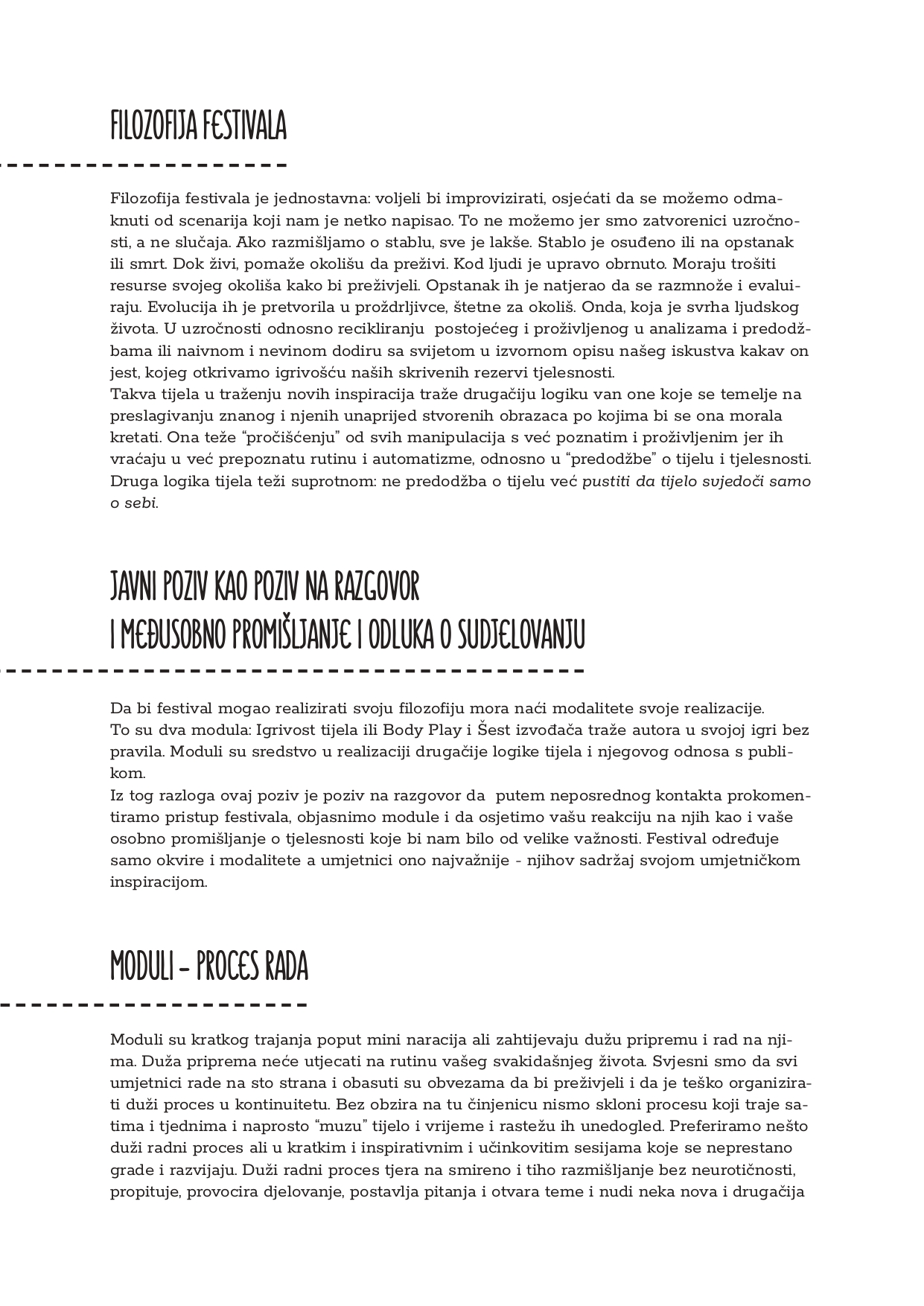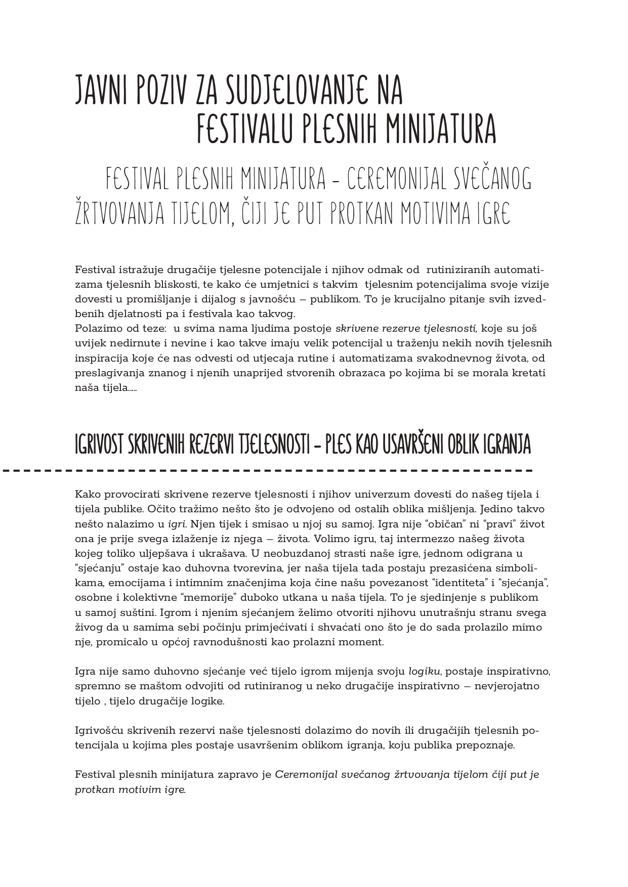 Edukacija se odvija putem studijske djelatnosti razlčitih plesnih sadržaja, plesnih produkcija (rad na plesnim predstavama i projektima većeg ili manjeg obima, različite prezentacije određenog sadržaja) te postprodukcija (organiziranje izvođenja predstava i projekata u vlastitoj produkciji i koprodukciji).